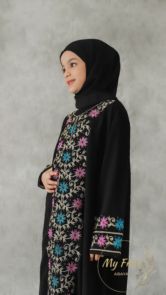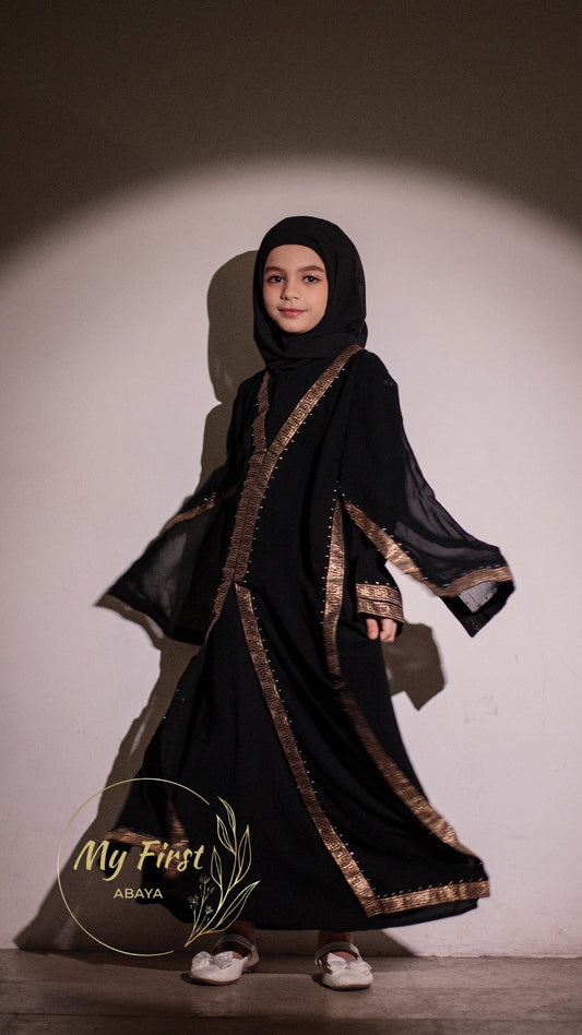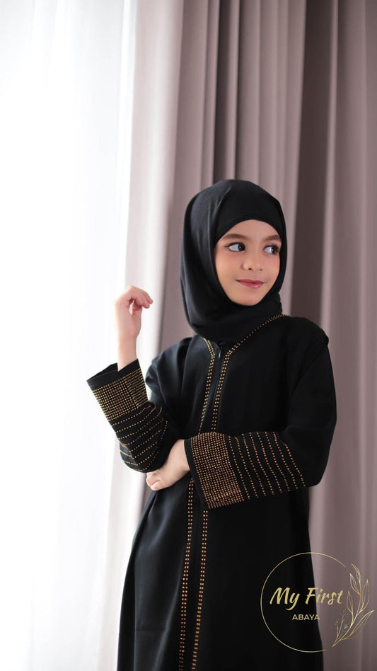 The Hawwa abaya. Modest black girls abaya with Swarovski rhinestones throughout the dress. Sizes available for young girls ages 4 to 12 years old.