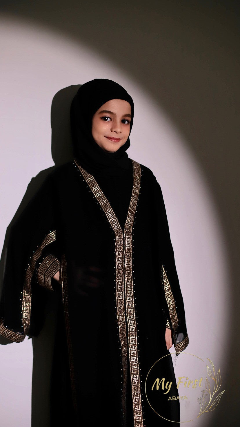 The Aasiyah abaya. Modest dress for young girls. Ages 4 to 12 years of age. Plain black headscarf is included.